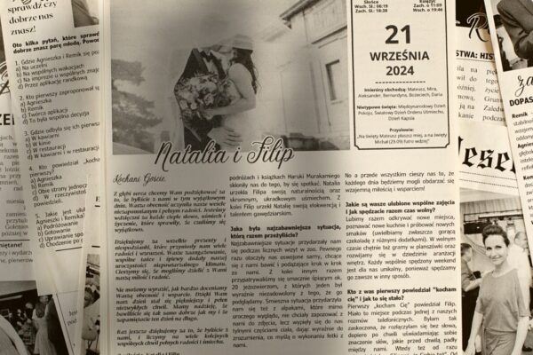 Układ graficzny, treści, które mają się na niej znaleźć, rozmiar zdjęcia – wszystko zależy od Was i Waszych pomysłów. Nasza rola? Stworzyć dokładnie to, czego pragniecie! ❤️ Przykładowa okładka? Może taka, która opowiada o parze młodej, a centralnym punktem jest zdjęcie zrobione podczas Waszego wesela. To tylko jedna z wielu inspiracji, które możecie wykorzystać jako punkt wyjścia do zaprojektowania własnej, niepowtarzalnej okładki. Pamiętajcie, że Wasza okładka to coś więcej niż gazeta – to pamiątka, która