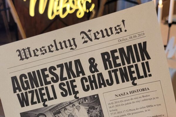 Chcecie, aby Wasi goście poznali Was jeszcze lepiej, a przy tym świetnie się bawili? 🎉 Nasza gazeta natychmiastowa to idealna okazja, by wprowadzić quiz o Waszej historii miłości i ciekawostkach z życia! 💖 📝 Co może zawierać quiz?– Jak długo znacie się z przyszłym małżonkiem?– Gdzie odbyła się Wasza pierwsza randka?– Kto pierwszy powiedział „kocham Cię”?– Wasze ulubione wspólne hobby… i mnóstwo innych pytań, które pozwolą gościom poznać Waszą historię w zabawny sposób! 🎨 Chcecie,