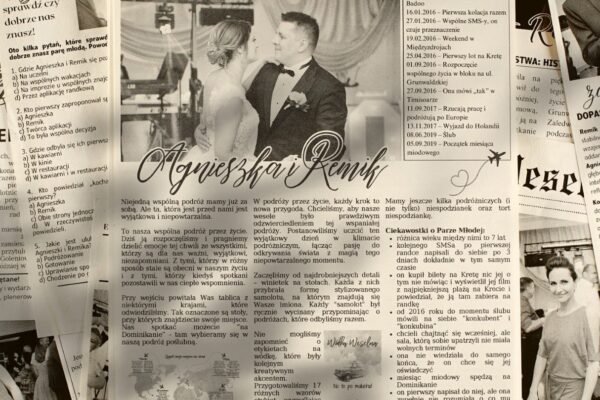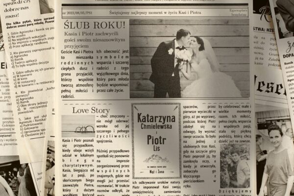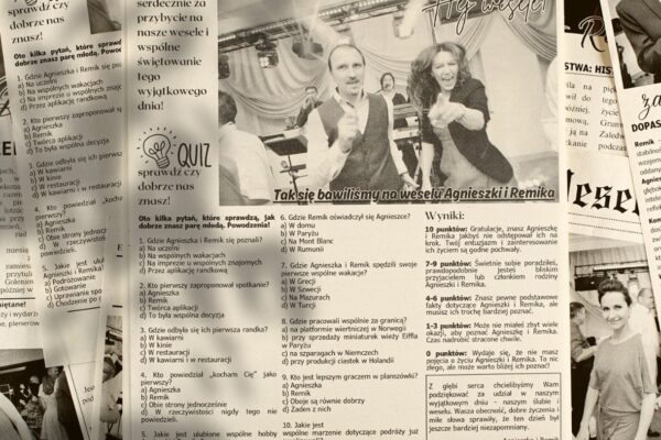 Czy wiecie, że okładka gazety z waszego wesela może zawierać dokładnie to, co sobie wymarzycie? Jednym z naszych ulubionych pomysłów jest quiz o parze młodej, który ułożymy wspólnie z wami. To świetna okazja, by pozwolić gościom lepiej was poznać albo sprawdzić, jak dobrze już was znają! 🥰 Quiz na gazecie to nie tylko wyjątkowa atrakcja, ale także inspiracja do rozmów i świetnej zabawy przy stole. 🎉 A co najważniejsze – będzie to pamiątka, którą wasi