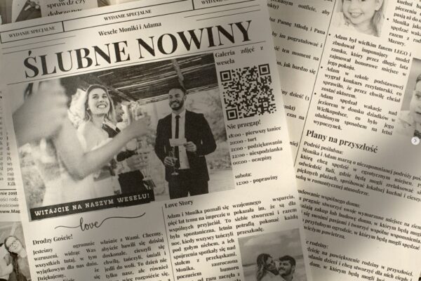 Marzycie o gazecie weselnej, która pomieści wszystkie najważniejsze szczegóły Waszego dnia? Nasze dwustronne wydanie to odpowiedź dla tych, którym jedna strona to za mało! 🎉✨ 📖 Co znajdzie się w dwustronnej gazecie?💌 Podziękowania dla gości – podkreślcie, jak wiele dla Was znaczą.📅 Harmonogram wesela – najważniejsze godziny, które ułatwią gościom orientację.🔗 Kod QR – np. do galerii zdjęć, filmu z zaręczyn lub Waszej playlisty weselnej.❤️ Love Story – Wasza piękna historia od pierwszego spotkania aż
