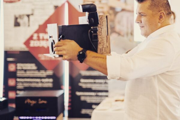 Nie możemy się nie pochwalić – sprzęt, którym fotografujemy Waszych gości, to prawdziwa perełka! 🔥 Przez wiele tygodni pracowaliśmy nad tym, by stworzyć coś wyjątkowego. Efekt? Stylizowany na stary aparat wielkoformatowy, który nie tylko świetnie wygląda, ale też spełnia swoją rolę w 100%. ✨ Dlaczego nasz aparat przyciąga spojrzenia? To nie jest zwykły sprzęt – jego design inspirowany jest aparatami z dawnych lat, co idealnie pasuje do klimatu eleganckich wesel i imprez.Jest nie do przeoczenia