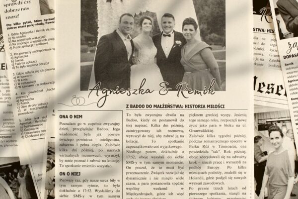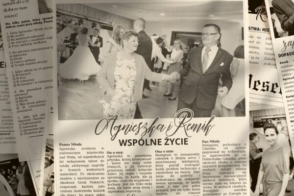 Układ graficzny, treści, które mają się na niej znaleźć, rozmiar zdjęcia – wszystko zależy od Was i Waszych pomysłów. Nasza rola? Stworzyć dokładnie to, czego pragniecie! ❤️ Przykładowa okładka? Może taka, która opowiada o parze młodej, a centralnym punktem jest zdjęcie zrobione podczas Waszego wesela. To tylko jedna z wielu inspiracji, które możecie wykorzystać jako punkt wyjścia do zaprojektowania własnej, niepowtarzalnej okładki. Pamiętajcie, że Wasza okładka to coś więcej niż gazeta – to pamiątka, która